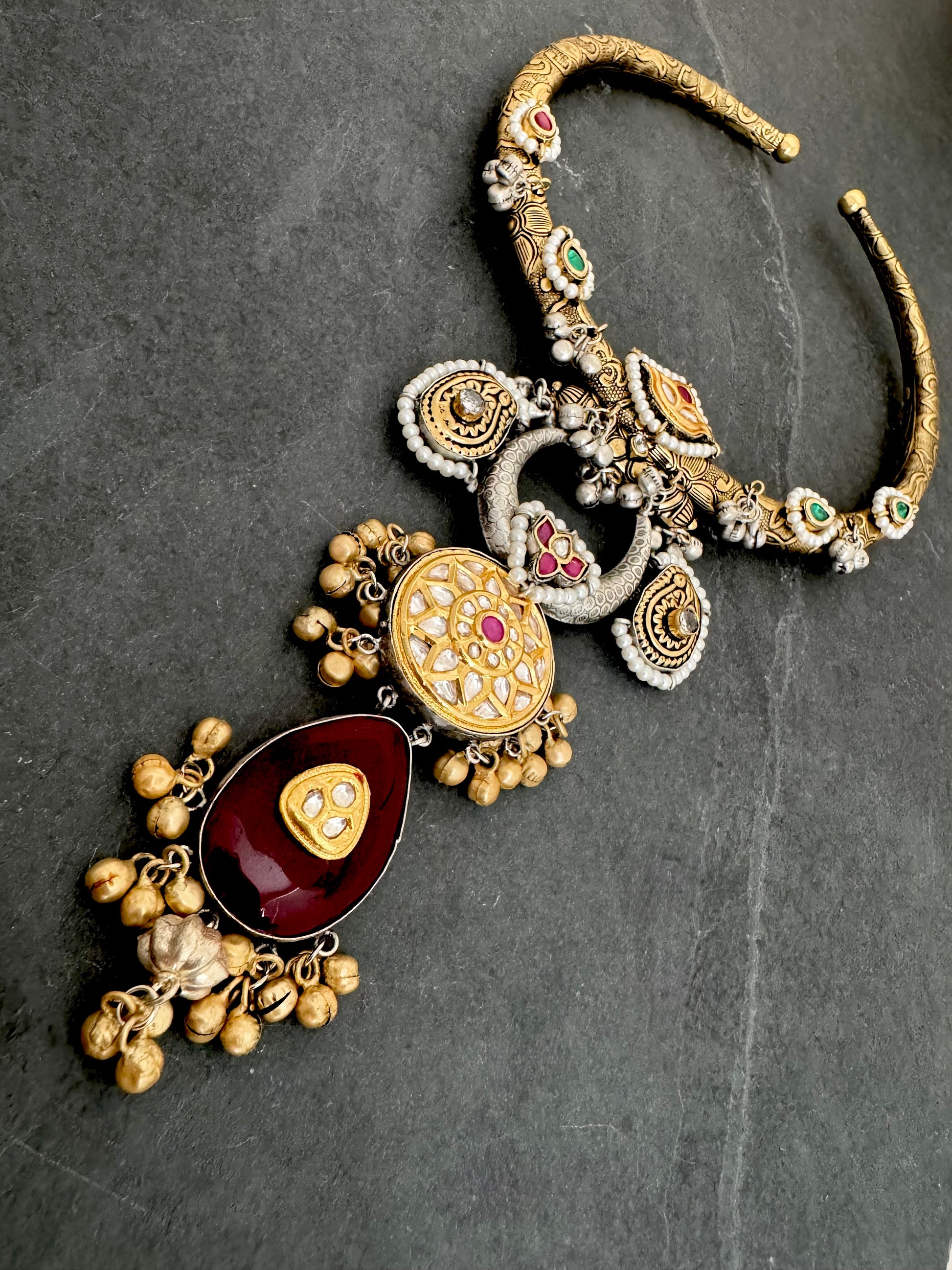 Embrace effortless elegance with this intricately carved Bohemian Hasli necklace, blending silver and gold tones in a free-spirited, layered design. A perfect fusion of metallic hues, its two-tone finish adds a touch of modern charm to timeless bohemian style.