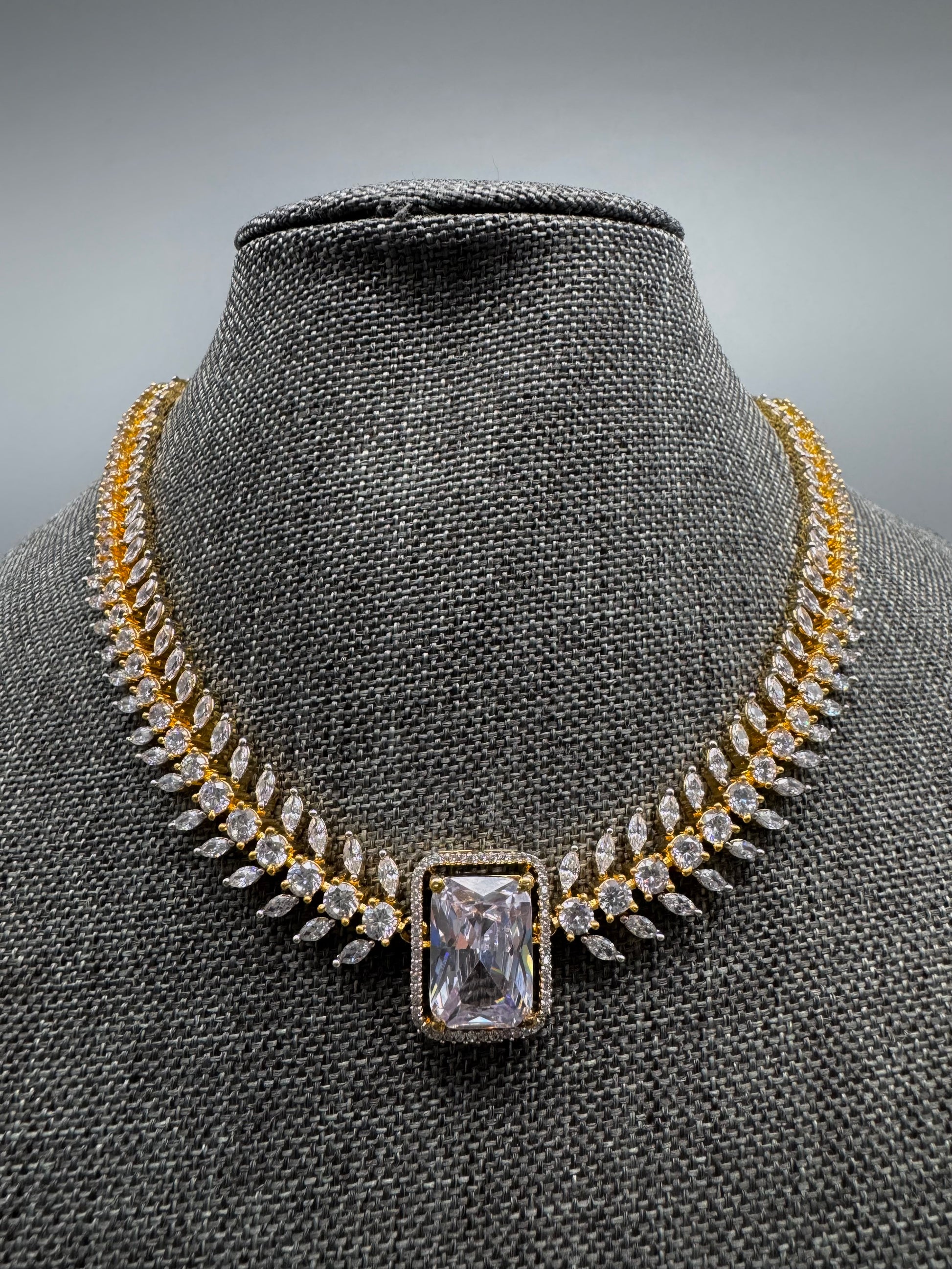 This elegant fern-design gold finished necklace set features shimmering cubic zirconia leaves gracefully framing a stunning emerald-cut centerpiece. A versatile statement piece that complements both ethnic ensembles and modern outfits with effortless charm.