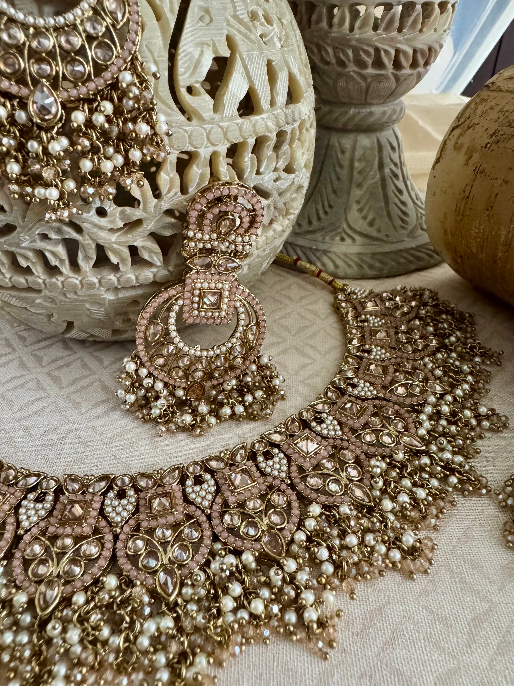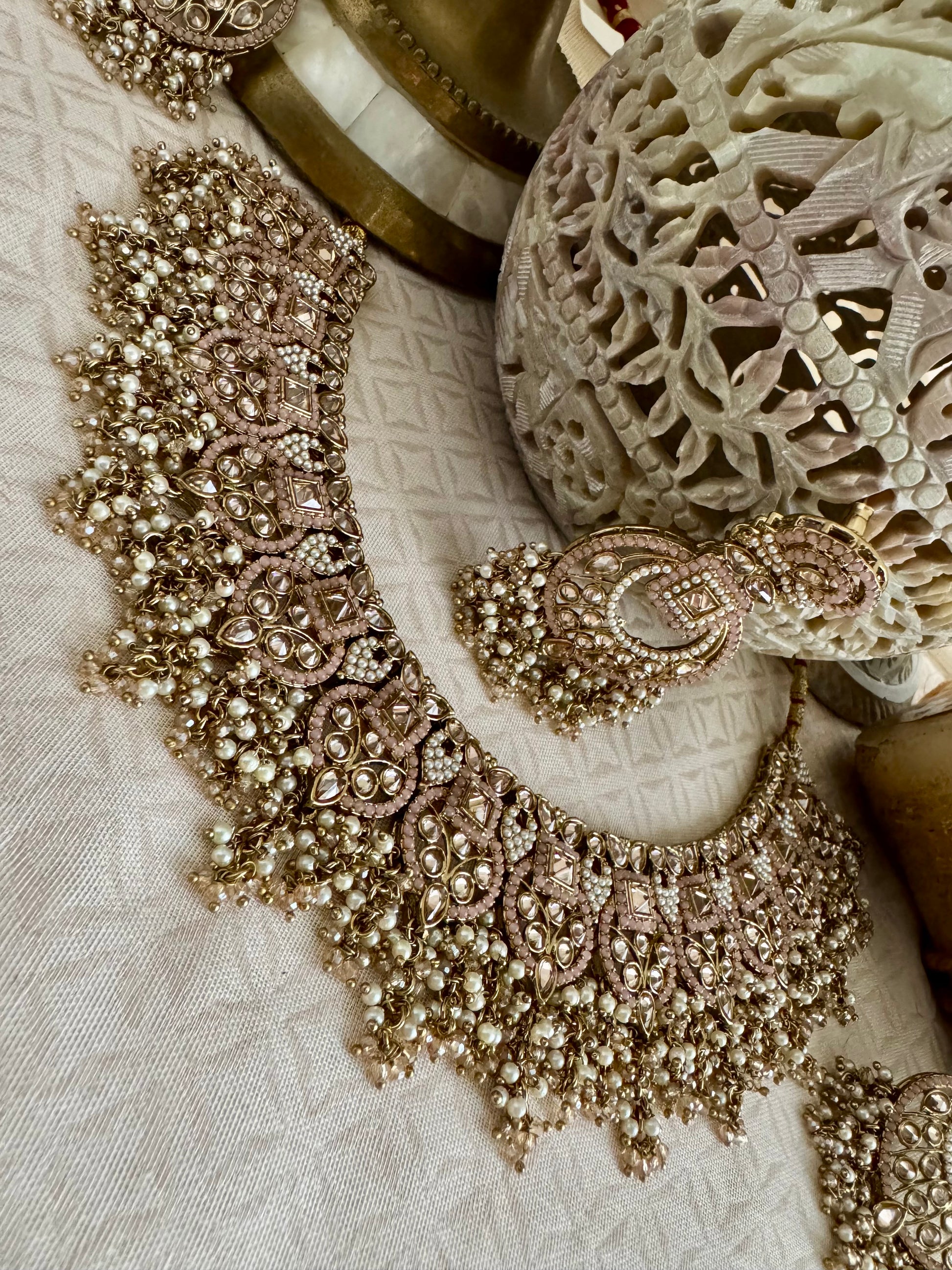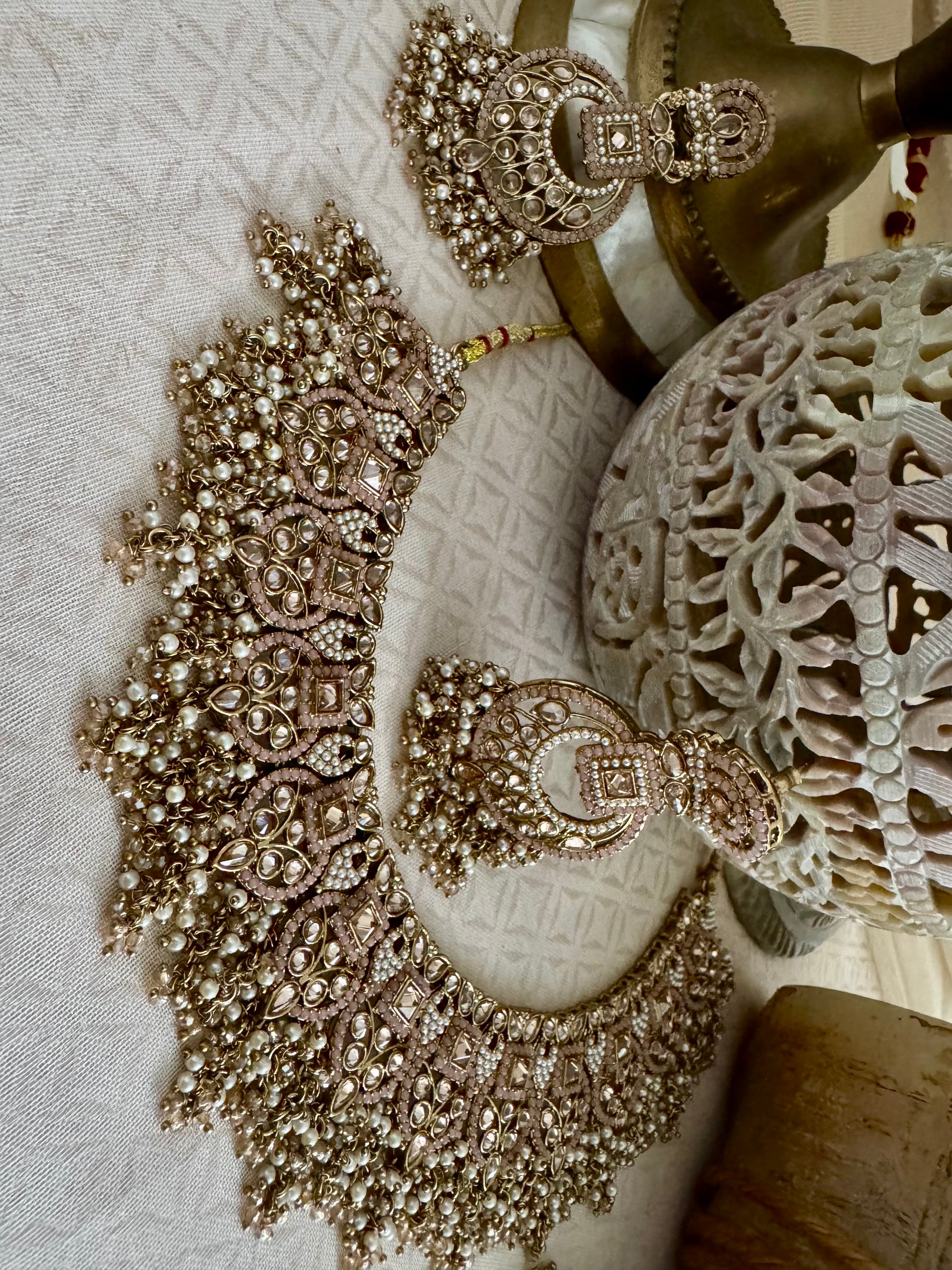 This traditional antique gold necklace set exudes timeless elegance, adorned with intricate craftsmanship that reflects heritage and artistry. Every element, from the delicate filigree patterns to the finely detailed motifs, tells a story of skilled hands and cultural legacy. Rich in character and opulence, it is more than just jewelry—it's a piece of history passed down through generations.