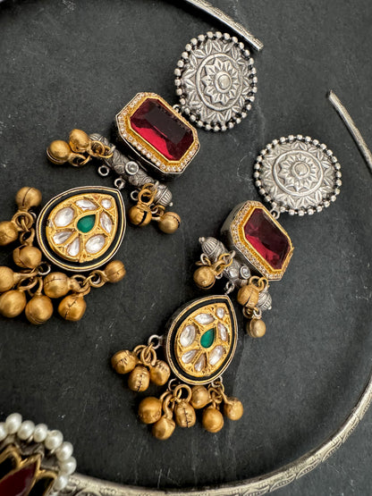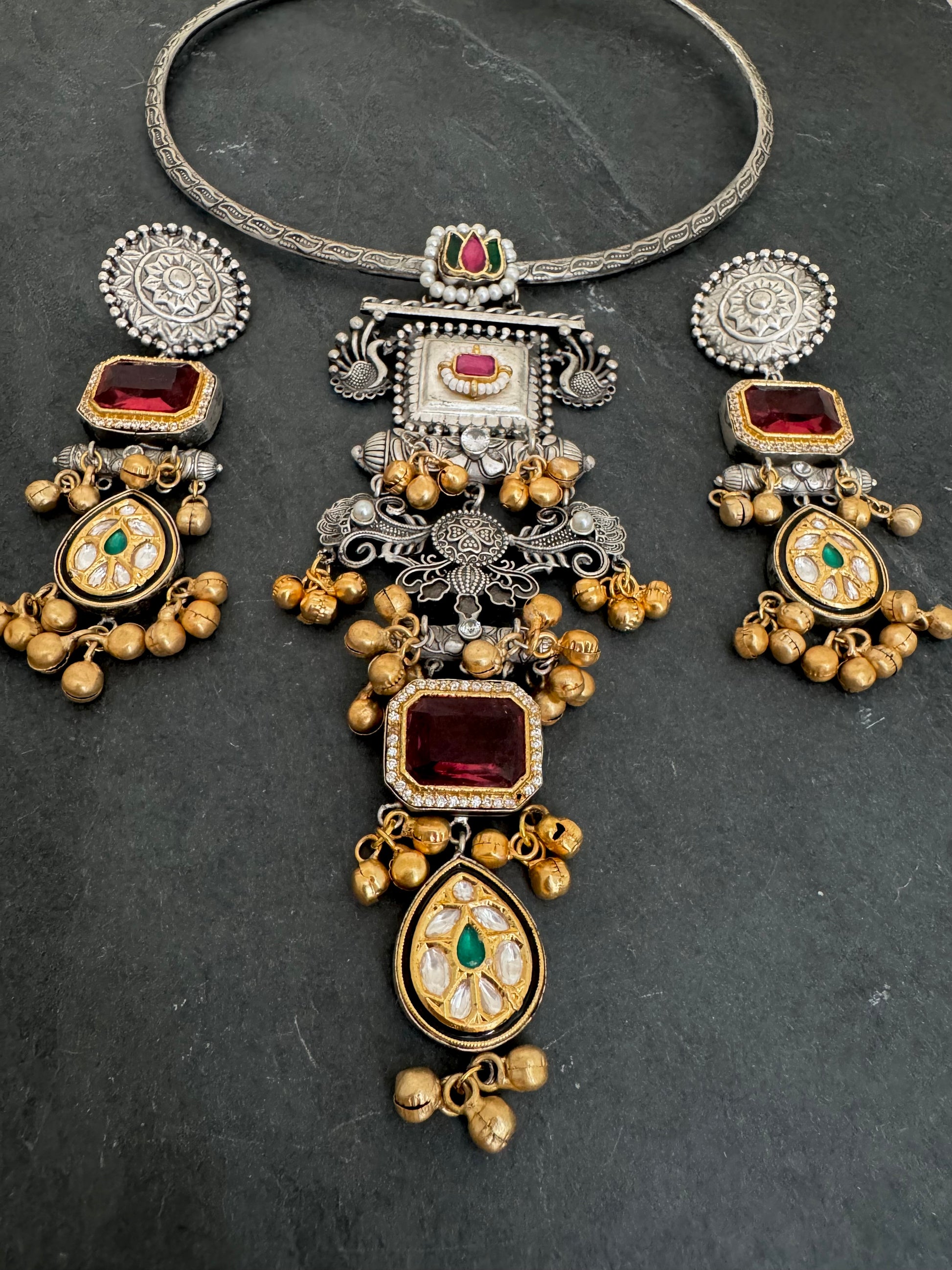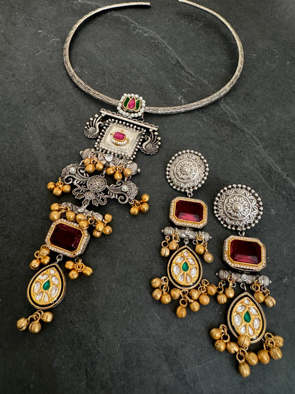 Embrace effortless elegance with this intricately carved Bohemian Hasli Necklace blending silver and gold tones in a free-spirited, layered design. A perfect fusion of metallic hues, its two-tone finish adds a touch of modern charm to timeless bohemian style.