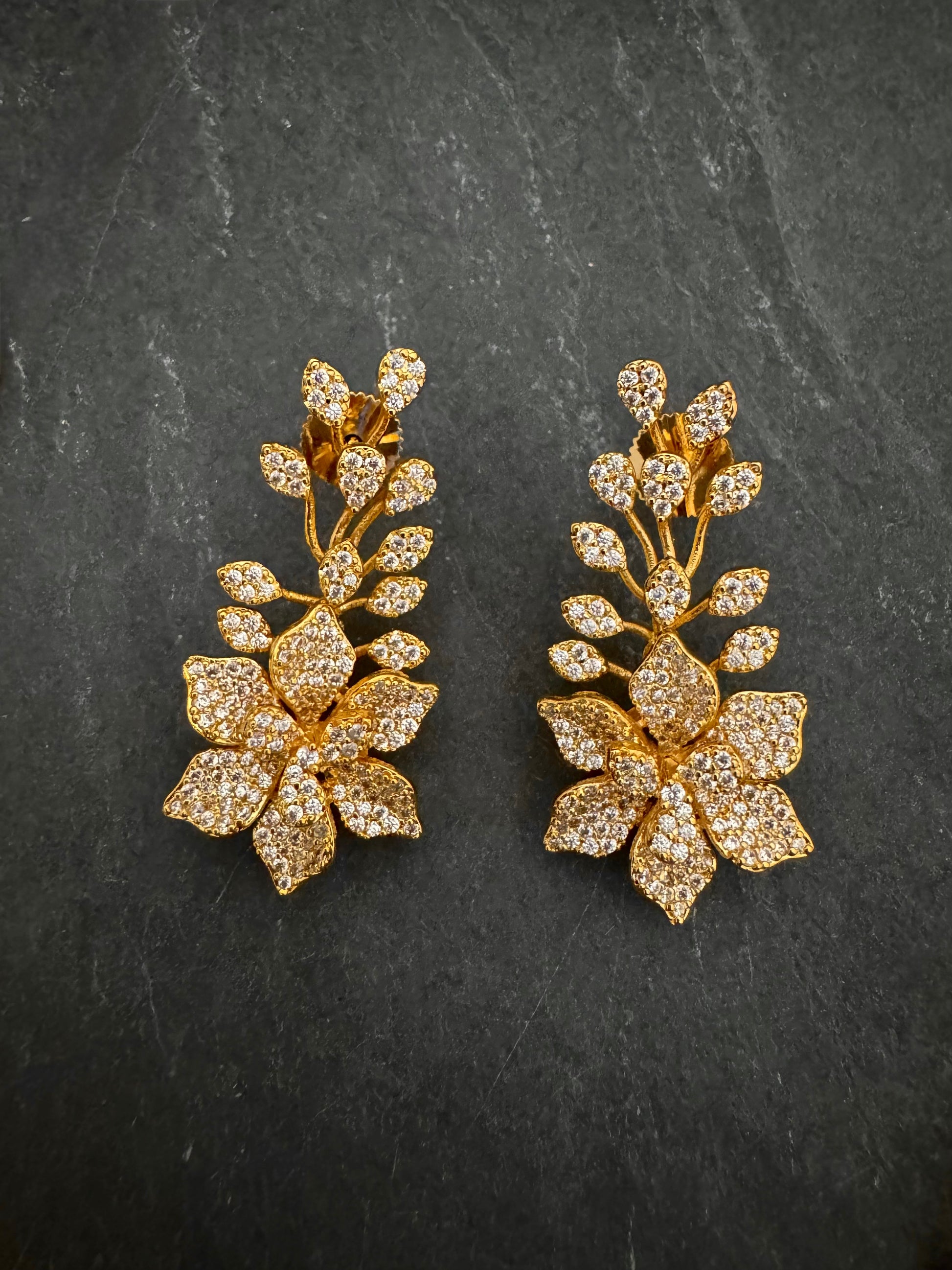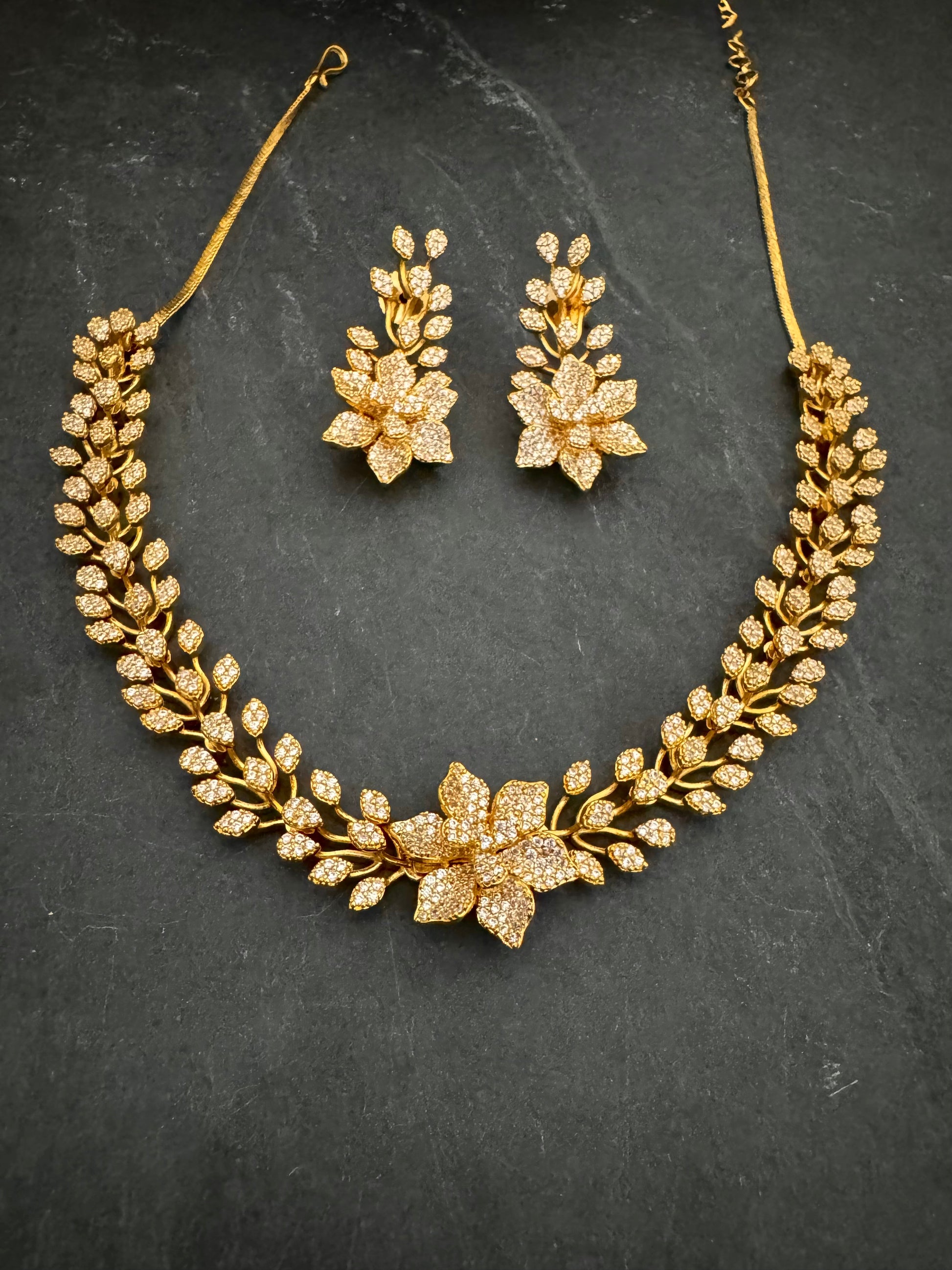 An intricately carved, gold-plated bridal necklace set blooms with three-dimensional flowers and delicately layered petals. Each curve is sculpted with precision, creating a lifelike floral silhouette. Paired with matching earrings, this set radiates timeless elegance for the modern bride.