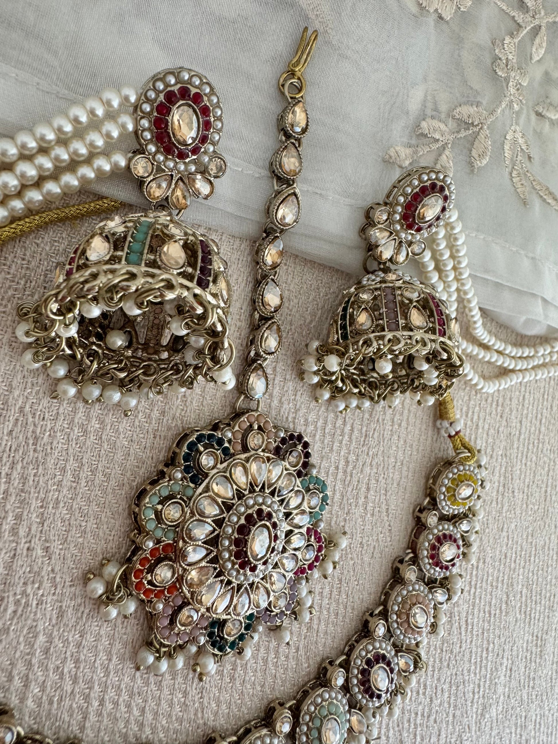 Make a statement with delicate pearl saharas that add a touch of royal elegance, perfect for any occasion. A timeless piece, this traditional necklace set features intricate craftsmanship that seamlessly pairs with any outfit - casual or formal.